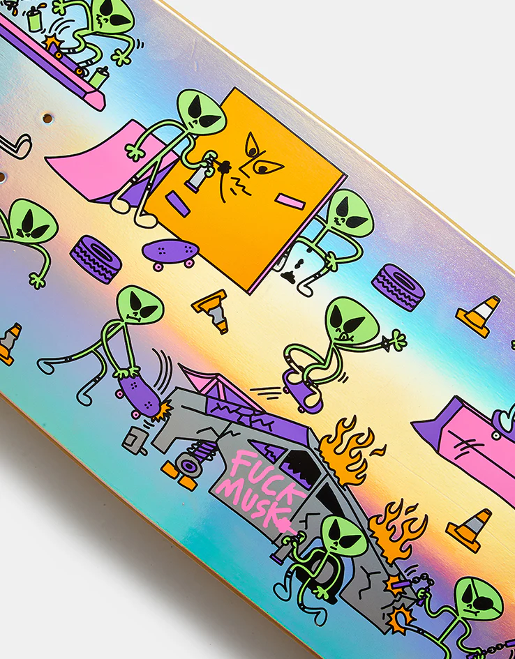 The Blast Skates Alien Demo Holooraphic Foil Skateboard Deck comes in at 9.25" wide and features a holographic foil background.