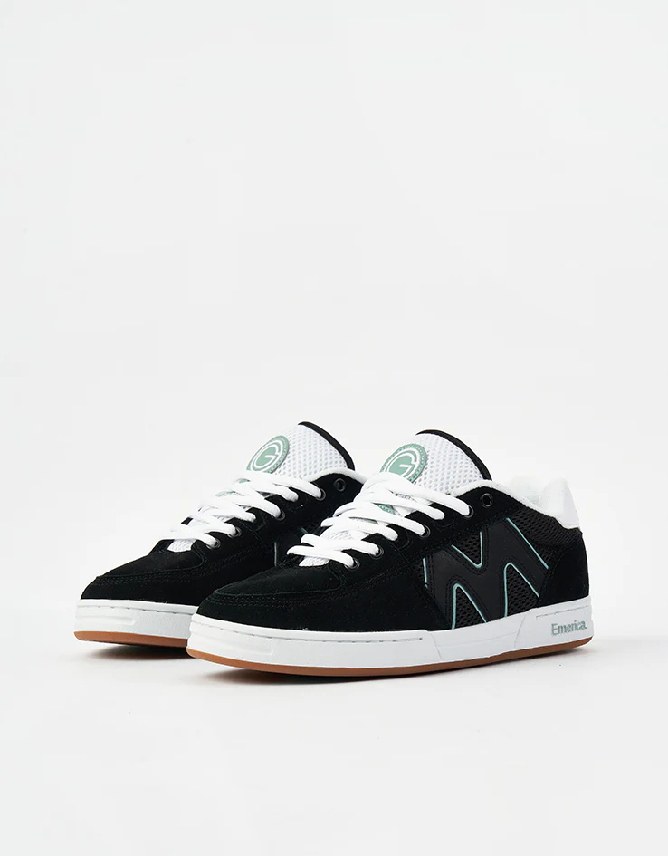 (Re)introducing the Emerica OG-1 Skate Shoes, a late 90s classic reissued with updated tech, including a bulletproof full rubber cupsole, a clean suede-mesh upper in Black/White/Green colouring, a triple stitch reinforcement in high-abrasion zones for added durability, and Herringbone tread for grip.
